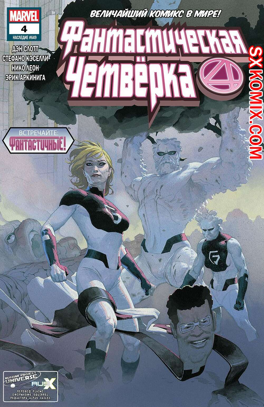 Комикс Фантастическая Четвёрка. Fantastic Four. Часть 4 Рид, Сью и дети из Фонда Будущего всё ещё утеряны, и доподлинно неизвестно, живы или нет. И пока Джонни до сих пор надеется их отыскать, Бен уже давным давно сложил руки и теперь думает, как ему жить дальше. И тут, откуда ни возьмись, - сигнал. Заветная цифра 4 в небе. Неужели величайшая в мире команда вернулась в полном составе.