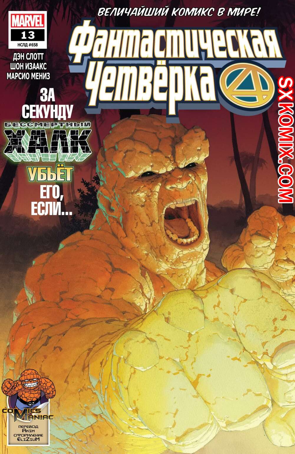 Комикс Фантастическая Четвёрка. Fantastic Four. Часть 13 Рид, Сью и дети из Фонда Будущего всё ещё утеряны, и доподлинно неизвестно, живы или нет. И пока Джонни до сих пор надеется их отыскать, Бен уже давным давно сложил руки и теперь думает, как ему жить дальше. И тут, откуда ни возьмись, - сигнал. Заветная цифра 4 в небе. Неужели величайшая в мире команда вернулась в полном составе.
