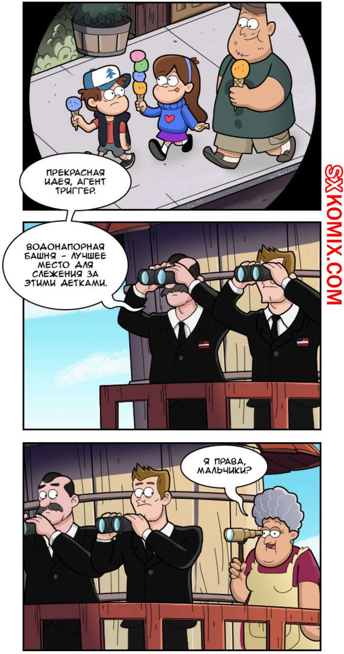 Комикс Гравити Фолз. Gravity Falls. Часть 8. Девушка стала ссориться с отцом, потому что он решил отправить ее домой. Он сказал ей найти работу, иначе она будет все лето рубить деревья, чего девушка не может допустить.