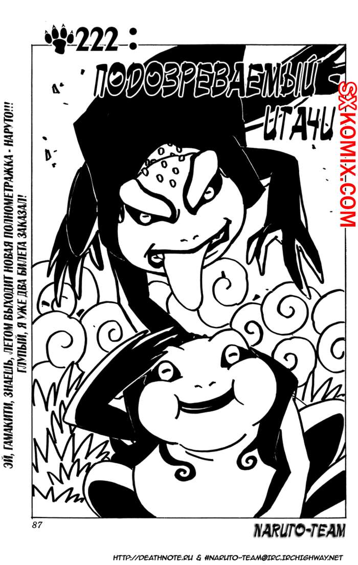 Комикс Наруто. Naruto. Часть 222. Маленький Саске услышал, что к его брату Итачи пришли ниндзя из его клана. Ему не понравилось, как они к нему относились, поэтому Итачи взбесился и их всех сбил, что шокировало Саске.