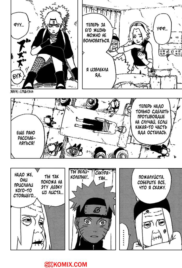 Комикс Наруто. Naruto. Часть 253. По подороге Наруто, Какаши и Сакура встречают Темари Сан и она отправляется вместе с ними. Они посещают раненого Канкуро и Сакура бросается ему на помощь..