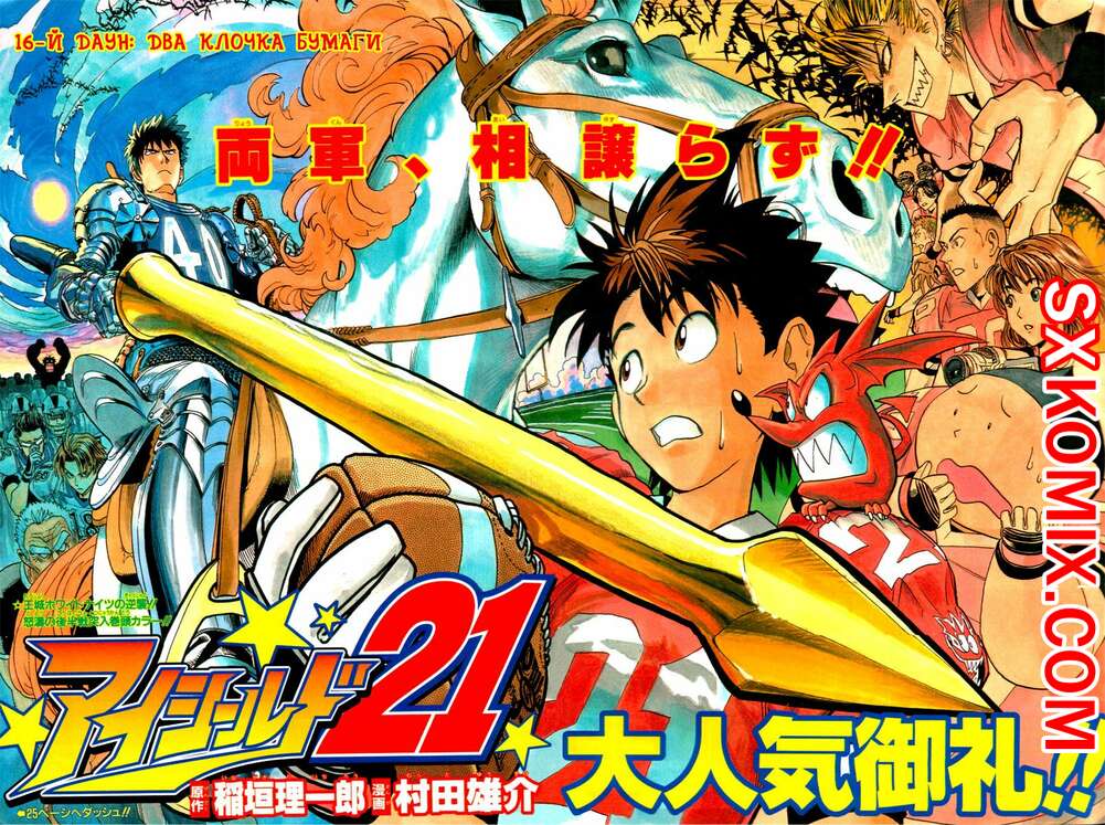 Комикс Айшилд 21. Eyeshield 21.. Часть 16. Молодой парень пошел в старшую школу, думая, что начнет новой жизнь без издевательств. Но не тут то было и над продолжают издеваться школьные хулиганы. Но парня перед под свое крыло капитан школьной футбольной команды, которые зовет парня присоединиться к нему.